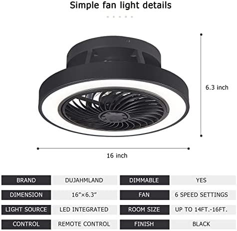 - At amazon.com you can purchase DUJAHMLAND Flush Mount Ceiling Fan with Lights ,16inch Bladeless Low Profile Ceiling Light with Remote Control,3 Colors 7 Blades 6 Gear Wind Flush Mount Bedroom Ceiling Fan(16inch, Black) for only $115,99