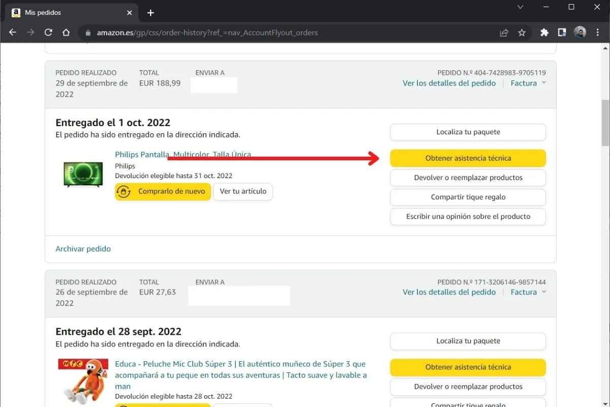 - Seleccionar la categoría más adecuada. Para un producto, dando clic a “Mi entrega, pedido o devolución”